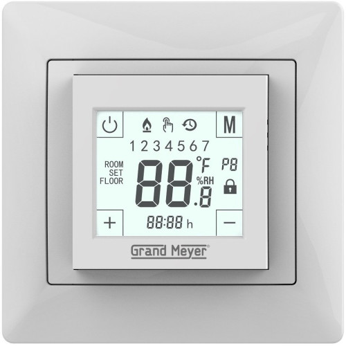 Grand Meyer Mondial Series W225, программируемый терморегулятор с сенсорным дисплеем для управления отоплением электрического типа. Возможность программируемого а так же ручного управления. Возможность установки недельного периода 5+2/6+1/7 дней. Максимальная нагрузка 3600 W. Установка в стандартную монтажную коробку. Память настроек при отключении питания. Огнезащитный пластик. NTC датчик. Диапазон установки: от +5оС до +35оС (заводские).
